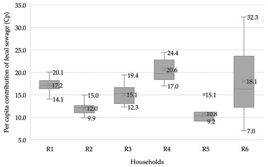 Households R1 and R6, with one and eight inhabitants, respectively, exhibited average CpP values of 17.28 L/cap.day and 19.14 L/cap.day. These values lie between 14.0 L/cap.day [] and 21.2 L/cap.day []. The first CpL value was obtained by measuring 100 urban households in São Paulo over seven consecutive days [], whereas the second CpL (21.2 L/cap.day) was estimated for residential households in Australia [].