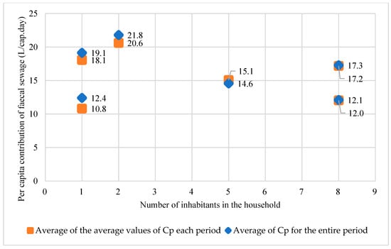 When determining Cp based on water consumption, it is also necessary to account for the volume generated by urine and feces. A healthy individual excretes an average of 128 g of feces and approximately 1.5 L of urine per day [], which represents about 9% of the total daily fecal wastewater volume produced by an adult—resulting in an average CpP of 17.48 L/cap.day.
