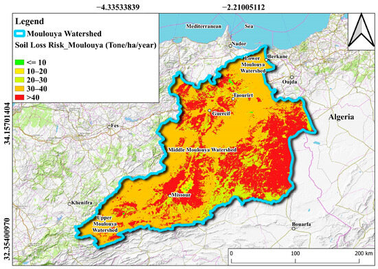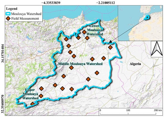 The Moulouya Watershed, located in Northeastern Morocco, spans an area of approximately 57,500 km2 and is characterized by diverse topography ranging from coastal plains to mountainous regions [20]. This watershed is one of the largest in Morocco, discharging into the Mediterranean Sea. The climate of the region is predominantly Mediterranean, with hot, dry summers and mild, wet winters [21]. Annual precipitation varies significantly across the watershed, ranging from under 200 mm in the arid lowlands to over 600 mm in the mountainous areas, contributing to varying erosion risks [22]. The watershed faces significant environmental challenges, including severe soil erosion, which threatens agricultural lands, water resources, and the overall stability of the ecosystem [23,24]. The Moulouya River and its tributaries are essential for the region’s agriculture, but ongoing soil erosion has led to sedimentation in the riverbeds and reservoirs, reducing their capacity and exacerbating water management issues (see Figure 1).