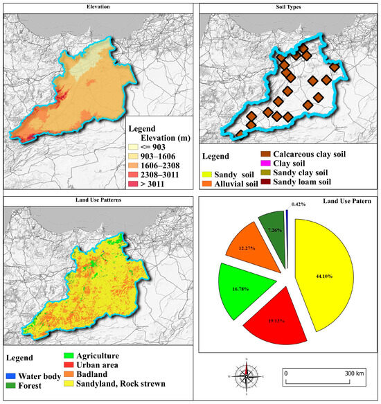 Geospatial distribution of elevation, soil types, and land use patterns in the Moulouya Watershed.