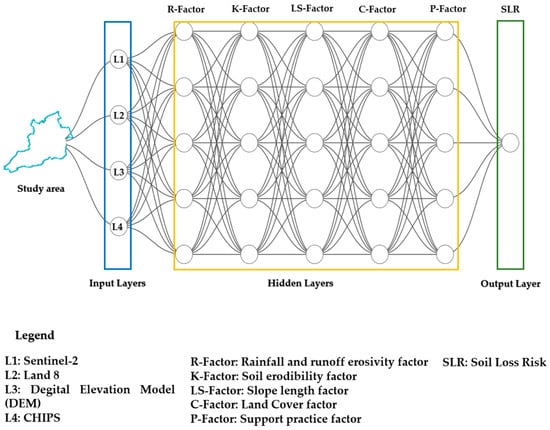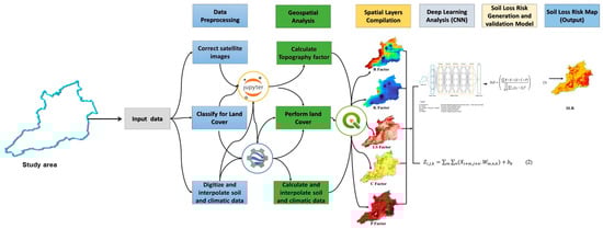The core of this study’s approach is the use of Convolutional Neural Networks (CNNs) to predict soil loss risk. The CNN model was designed to process multi-layered spatial inputs (see Equation (1)), including satellite imagery and derived erosion factors, capturing complex patterns that traditional empirical models cannot [33,37]. The architecture of the CNN consisted of several convolutional layers followed by pooling layers and fully connected layers, allowing the model to learn the spatial hierarchies of features [38]. The model was trained using a labeled dataset of soil loss estimates derived from field measurements and validated against the RUSLE and USLE models [39].