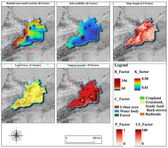 where A represents soil loss (t/ha/year), R is the rainfall erosivity factor, K is the soil erodibility factor, LS is the topographic factor, C is the cover management factor, and P is the support practice factor [3].
