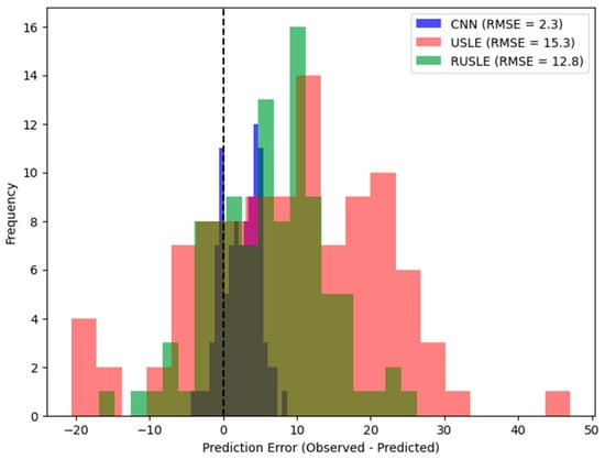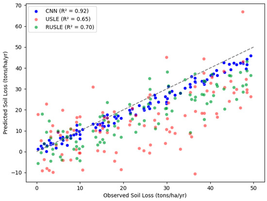 The enhanced performance of the CNN model can be attributed to its ability to learn directly from high-resolution satellite imagery and integrate diverse datasets, including topographic and climatic data. This capability allows the model to dynamically adjust to environmental changes, providing real-time soil loss predictions that traditional models cannot achieve. The comparative analysis highlights that while USLE and RUSLE remain valuable for their simplicity and ease of use, their applicability is limited in complex environments, underscoring the need for more advanced modeling approaches like deep learning [58].