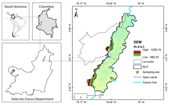 La Unión municipality is in the northern region of the Valle del Cauca department in Colombia. It forms part of the Roldanillo-Unión-Toro (RUT) agricultural irrigation district, which is recognized as one of the most significant irrigation areas in the country (Figure 1). This municipality serves as a vital agricultural hub, contributing over 50% of the food crop production within the Valle del Cauca Department (southwest Colombia). The RUT district encompasses approximately 10,256 hectares, managed by the RUT Users Association (ASORUT) (La Unión, Colombia), which oversees water access for the irrigation of various crops.