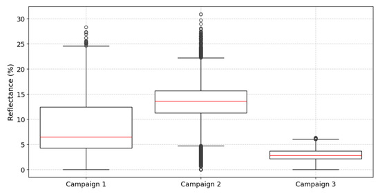 Campaign 2 demonstrates the highest median reflectance, approximately 13.66%, with a relatively narrow IQR (11.83% to 15.22%) (Figure 4). The symmetrical whiskers indicate a balanced distribution of reflectance values, reflecting uniform surface conditions during the sampling period. This consistency suggests a more stable environment, potentially influenced by steady water flow or uniform light conditions. The elevated reflectance median compared to the other campaigns may be attributed to increased surface brightness or particulate matter during this period. The plot also indicates that this campaign presented the highest number of outliers.
