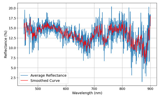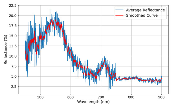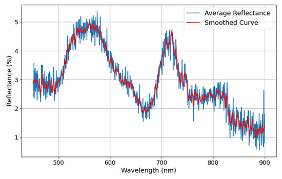 Variability in the average reflectance curve (blue line) is evident throughout the visible range, with fluctuations potentially attributed to heterogeneity in water surface conditions, including differences in particulate matter, algal distribution, or variable light conditions during the scans. The smoothed curve (red line) effectively captures the general trend, providing a robust representation of the spectral reflectance pattern.
