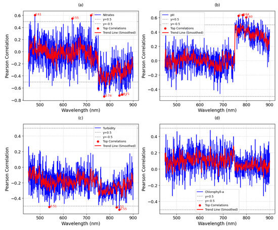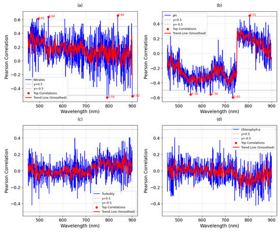 Wavelength versus Pearson correlations per water-quality parameters for Campaign 2: (a) nitrates; (b) pH; (c) turbidity; (d) chlorophyll-a.