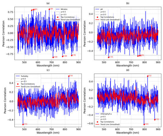 The Pearson’s correlation analysis was structured into three stages. In the first stage, a Python version 3.10-based visualization tool plotted the correlation coefficients as a function of wavelength, highlighting significant thresholds (0.5 and −0.5) to demarcate regions of notable positive and negative correlations. The correlation values ranged between −0.88 and 0.85, with the strongest relationships observed in the 500–700 nm and 800–900 nm spectral regions. In the second stage, the tool identified the most significant correlations for each parameter, highlighting these on the plots with red markers and annotated values for enhanced interpretability. Finally, a Savitzky–Golay filter (window length = 11, polynomial order = 2) was employed to smooth the trend lines, reducing noise while preserving critical spectral features. This approach facilitated the identification of active spectral regions, where clusters of wavelengths exhibited correlations with specific water-quality parameters. The detailed graphical and statistical evaluation provided by this approach supports the identification of wavelength regions sensitive to specific parameters without relying on complex algorithms to detect initial trends in the data. This forms the basis for subsequent analyses and ensures the effective use of spectroscopic data in water-quality monitoring.