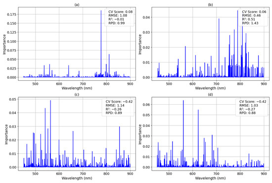 The feature importance results for turbidity highlighted key wavelengths in the 450–600 nm and 750–850 nm ranges, corresponding to scattering and absorption mechanisms in water. However, the model performed worse than a simple mean predictor, with a CV score of −0.33, RMSE of 0.72, R2 of −0.50, and RPD of 0.81, indicating that the spectral variability introduced by suspended solids was not effectively captured.