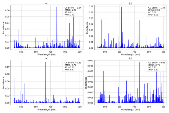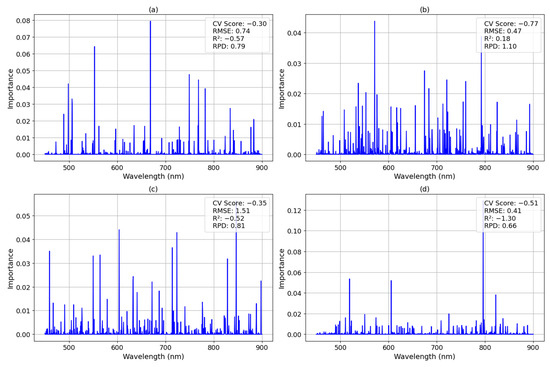 The feature importance analysis for nitrates indicated strong spectral contributions around 600 nm and 750–800 nm, with a maximum feature importance of 0.06 (Figure 13). While these wavelengths were identified as relevant, the model’s CV score of −0.24, RMSE of 1.27, R2 of 0.02, and RPD of 1.01 suggest that it marginally outperformed a simple mean predictor but lacked strong predictive accuracy.