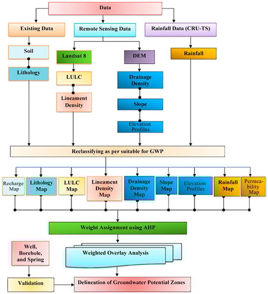 Recent advances in Geographic Information Systems (GIS) and Remote Sensing (RS) have provided powerful tools for mapping and assessing groundwater potential [17,18,19,20]. These technologies integrate various geospatial datasets to identify areas with high groundwater potential [19,21,22]. The combination of GIS, RS, and multi-criteria decision-making techniques has proven particularly effective for delineating groundwater potential zones (GWPZ), supporting informed decision-making for sustainable water resource management [1,17,19,23]. The Analytical Hierarchy Process (AHP), commonly used in GIS studies, allows for the assignment of relative weights to the different factors affecting groundwater potential, enhancing the accuracy of groundwater mapping [24,25,26,27].