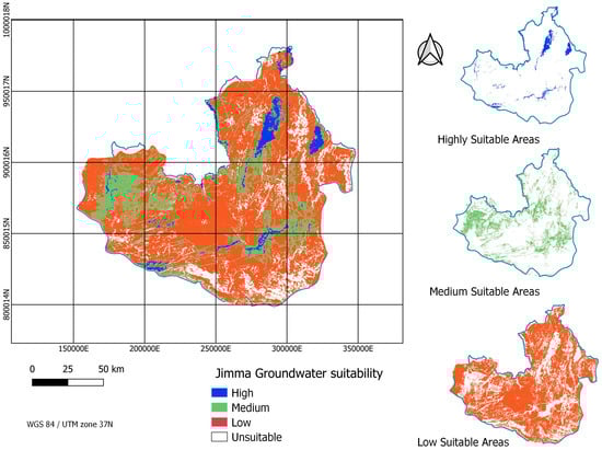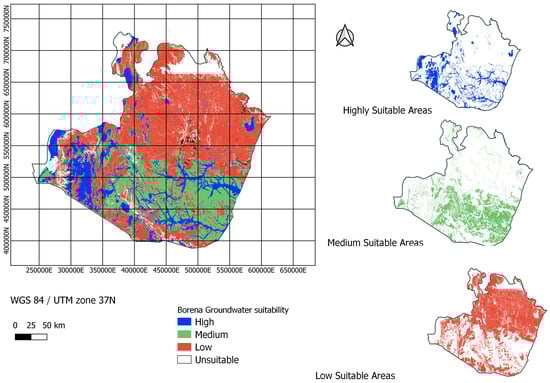 The groundwater suitability score was computed by adding the weighted factors and visualized using a rainbow color scheme, with red indicating low suitability and blue indicating high suitability. The suitability maps, scaled at 1:100,000, identified high, medium, and low groundwater suitability zones in Jimma and Borena. These results are consistent with studies conducted in semi-arid regions, underscoring the efficacy of GIS and remote sensing techniques for groundwater exploration [22,28,35,51,52].