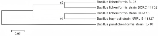 - Kumar, S.; Stecher, G.; Tamura, K. MEGA7: Molecular Evolutionary Genetics Analysis Version 7.0 for Bigger Datasets. Mol. Biol. Evol. 2016, 33, 1870–1874. [Google Scholar] [CrossRef] [PubMed]