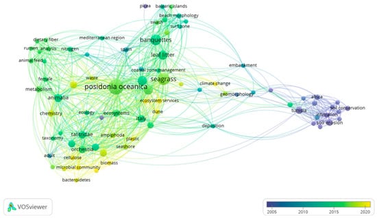 Temporal distribution of keywords related to P. oceanica banquettes in the scientific literature, based on a color gradient, from blue (older publications) to yellow (more recent publications). Moreover, the larger the size of the items and the smaller the distance between them, the greater is the strength of correlation.