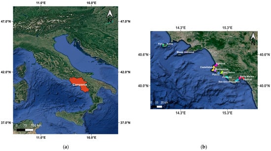 (a) Campania region; (b) Municipalities where the deposition of banquettes was recorded.