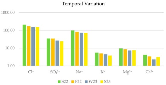Specifically, temporal variation was evaluated by averaging the concentrations of each anion across all sampling sites for each season. On the other hand, spatial variation was calculated by averaging the concentrations of each anion across all seasons for each sampling site. Figure 3 shows the temporal variation of the concentrations of six ions (Cl−, SO42−, Na+, K+, Mg2+, and Ca2+) measured across the four seasons. The concentrations are plotted on a logarithmic scale, facilitating the comparison of values across a wide dynamic range.