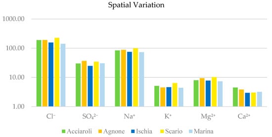 Figure 4 shows the spatial variation in the concentrations of six ions (Cl−, SO42−, Na+, K+, Mg2+, and Ca2+) across the five sampling sites along the Campania coast. As in the case of temporal variation, the concentrations are presented on a logarithmic scale.