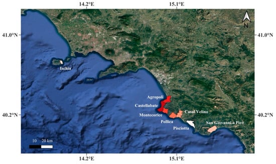 Location of the municipalities where the depositions of banquettes were recorded along the coastline of the Campania region.
