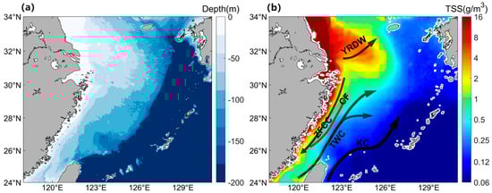 (a) Topography and (b) schematic diagram of the circulation system in the East China Sea. In (b), the background color represents climatological TSS, and the red line indicates the Zhejiang–Fujian coastal turbidity front. KC: Kuroshio Current; TWC: Taiwan Warm Current; YRDW: Yangtze River Diluted Water; ZFCC: Zhejiang–Fujian Coastal Current. CF: Coastal Front.