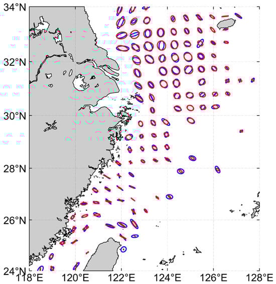 In order to analyze the influence of the ECS’s circulation system on the offshore transport pathways of coastal water masses, this study employed the Maximum Cross−Correlation (MCC) algorithm [30] to derive the surface current fields along the Zhejiang–Fujian coast from continuous TSS satellite imagery. The MCC method estimates the displacement of surface water features between sequential satellite images. It identifies the shift (in direction and distance) that produces the highest correlation between image pairs, effectively capturing the horizontal movement of water masses. This approach allows for the derivation of surface residual currents without direct velocity measurements. To validate the reliability of the retrieved current fields, the tidal components within them were verified using the ECS tidal current fields simulated by the FVCOM model, as presented by Xuan et al. [31]. The M2 tidal constituent in Xuan’s model data aligns well with cotidal charts obtained from satellite altimeter and coastal tide gauge observations, demonstrating high accuracy in simulating the tidal current fields of the ECS and confirming the model’s reliability. Figure 2 compares the M2 tidal ellipses extracted from the retrieved current fields with those from the model data. The results demonstrate a strong agreement across most of the study area, with the exception of shallow nearshore regions, thereby indicating the high credibility of the retrieved surface current fields. The validated current fields were then processed by subtracting the concurrent tidal currents predicted by TPXO, yielding the residual current fields.
