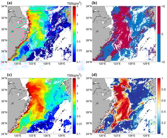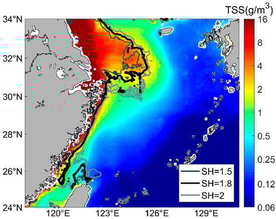 Previous studies have demonstrated that the distribution of surface TSS in the ECS is primarily influenced by tidal mixing, riverine input, wind-induced stirring, and circulation systems [33,34]. The coastal ECS is globally renowned as a strong tidal region, dominated by semidiurnal tides. The maximum tidal amplitude of the M2 constituent exceeds 1 m, with tidal current velocities reaching 1 m/s. Additionally, the S2 constituent exhibits a maximum amplitude of 0.6 m and a tidal current velocity of 0.5 m/s [35,36]. The vertical mixing caused by the strong interaction between tidal currents and coastal topography resuspends bottom sediments into surface waters, thereby dominating the spatial distribution of high TSS concentrations in coastal areas. In Figure 5, the contour of 1.8 (thick black line in Figure 5), representing the boundary of the tidally well−mixed zone [37], nearly coincides with the boundary of climatological high-TSS regions, further confirming the dominant role of tidal forcing in TSS distribution.