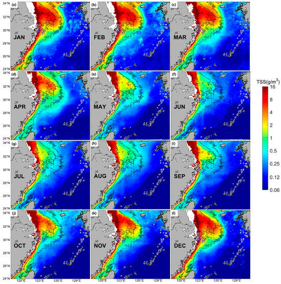 (a–l) Climatological monthly mean TSS distribution from May 2012 to December 2020 (background color), with black contours indicating the 20 m, 50 m, and 80 m isobaths.