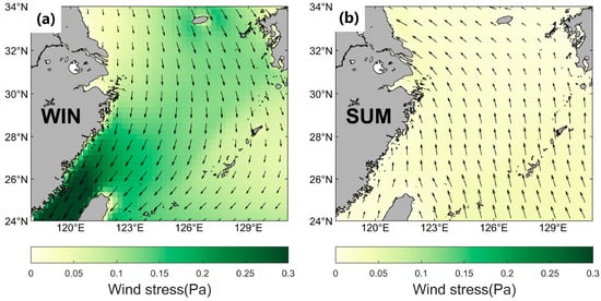 Climatological winter (a) and summer (b) sea surface wind fields from May 2012 to December 2020. The background color represents wind stress, with arrows indicating wind vectors.