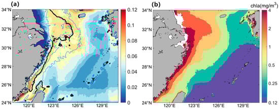 (a) Climatological distribution of (May 2012–December 2020); (b) climatological distribution of Chl-a (June 2002–March 2024). In (a), the black contours indicating the K = 1.8 isoline and blue contours showing the 20 m, 50 m, and 80 m isobaths.