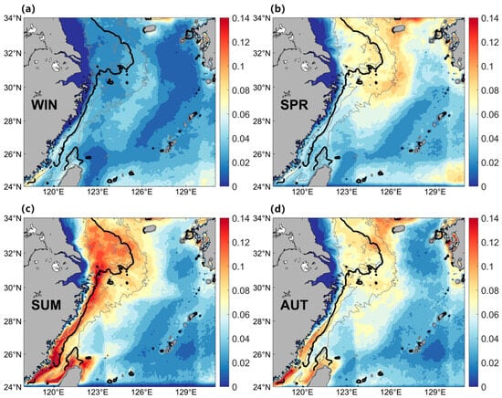 Seasonal distribution of the climatological from May 2012 to December 2020. (a) Winter. (b) Spring. (c) Summer. (d) Autumn. The black contours indicate the K = 1.8 isoline and gray contours show the 20 m, 50 m, and 80 m isobaths.