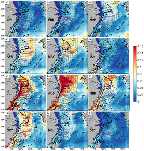(a–l) Climatological monthly mean distribution of from May 2012 to December 2020. Black arrows represent the residual current field derived from satellite observations, the black line denotes the K = 1.8 tidal mixing parameter contour, and semi-transparent purple arrows indicate potential offshore transport pathways.