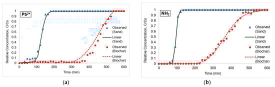 The adsorption coefficients indicate that biochar is a significantly more effective adsorbent for Pb2+ and NH3 compared to sand. The higher Kd values for biochar suggest that it has a greater capacity to retain targeted contaminants. This is mainly due to its much more complex surface chemistry and higher specific surface areas, which provide more active sites for adsorption. In contrast, low estimated Kd values on sand materials indicate that it is a less effective adsorbent for target contaminants, i.e., Pb2+ and NH3 in this study.
