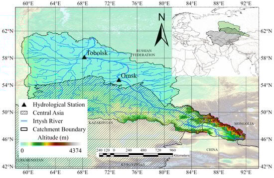 Location, topography, and the hydrological stations in the Irtysh River Basin.