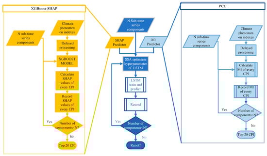 In this study, we used XGBOOST-SHAP to perform predictor selection. SHapley Additive Explanations (SHAP) was used to find the climate indices that have significant impact on the XGBoost, and these indices were selected as suitable predictors that constitute the input of LSTM. We also analyzed the physical meaning of the selected predictors. As shown in Figure 3, when setting up the XGBoost model, we used the indices in a time window from the current month to prior twelve months as inputs of XGBoost. XGBoost used all the indices to simulate each sub-time series component and then calculated the SHAP values for each index at various leading times. Finally, the SHAP values for each indices were summarized. We selected the predictors with SHAP values from high to low as inputs and also incorporated the historical runoff data. And the physical interpretation of the predictors selected by the XGBoost-SHAP was analyzed to verify the reasonability of XGBoost-SHAP for predictor selection (see Section 5).