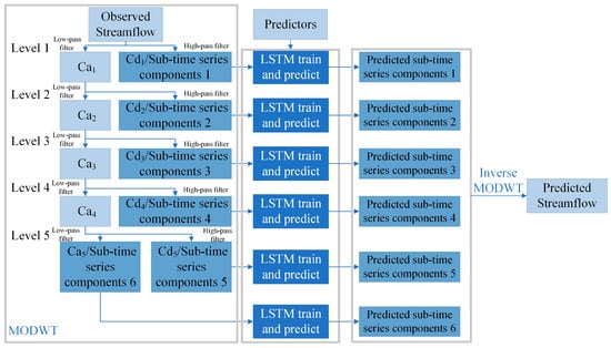 The flowchart of MODWT-LSTM model. Take the decomposition into six subsequences as an example.
