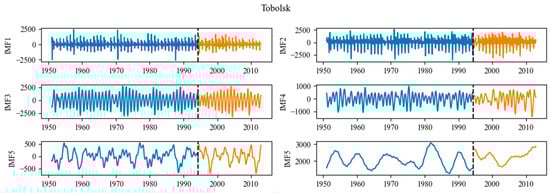 In this study, we use MODWT to apply sym4 mother wavelets to decompose the runoff sequences at the two hydrology stations into five sets of detailed coefficients and one set of approximate coefficients. The decomposition of streamflow at Tobolsk station is shown in Figure 5. The results shown in Table 2 indicate that the patterns of the decomposed sets during the training period and the test period did not show significant differences, which illustrates the robustness of the MODWT. This suggests that the model calibrated based on the decomposed runoff in the training period is reliable to be applied to predict the runoff in the test period.