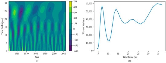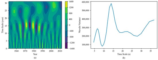 Real contour map of wavelet coefficients (a) and wavelet variance of monthly runoff (b) at the Omsk station.