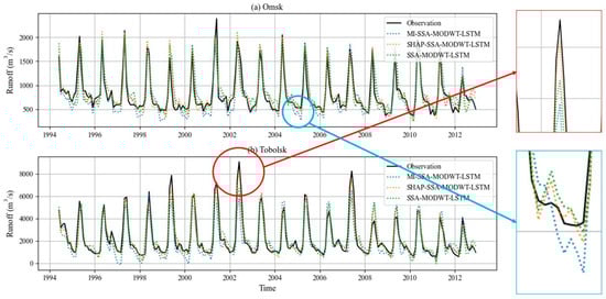 The predicted monthly runoff with a leading time of one month using the MI-SSA-MODWT-LSTM, SHAP-SSA-MODWT-LSTM, and SSA-MODWT-LSTM models at the Omsk station (a) and the Tobolsk station (b) in the test period.