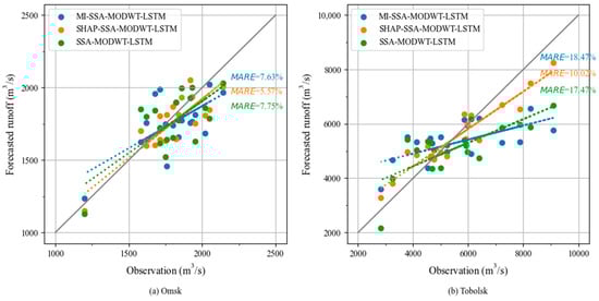 Scatter plots of observed and predicted runoff using MI-MODWT-LSTM, SHAP-MODWT-LSTM and MODWT-LSTM models for the Omsk stations (a) and Tobolsk station (b) in the months with highest flow (May at Omsk and June at Tobolsk).
