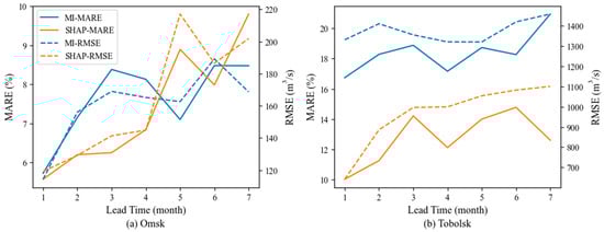 Figure 10 demonstrates that, for peak runoff months at the two hydrological stations, the performance of SHAP-MODWT-LSTM generally declines, with the MARE and RMSE increasing as the lead time extends from one to seven months. The reduction in performance at the Tobolsk station was more moderate than that at the Omsk station. This also shows that, in months with peak runoff, the performance of MI-MODWT-LSTM at the Omsk and Tobolsk stations exhibits a fluctuating downward trend, with the RMSE and MARE evidently increasing as the lead time extends. This suggests that the longer the leading time, the worse the results of the predictions. However, the decline of performance when lead time increases by using the SHAP method is slower than using the MI method as lead time increases from 1 to 4 months. This illustrates the advantage for using the SHAP method. With the extension of the forecast period, the correlation between the historical predictors and the forecast runoff will decline, resulting in the deterioration of the model’s performance.