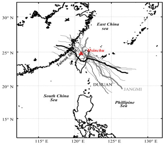Paths of selected historical typhoons (2001–2024) and location of the Hsinchu station.
