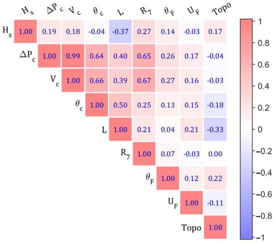 Evaluating the influence of different input variables on wave height prediction aligns with the above equation. This study utilized data from 13 historical typhoons, shown in Table 1, to construct a cross-correlation matrix, as shown in Figure 2. This matrix employs the Pearson correlation coefficient to quantify the relationships between variables. The analysis reveals that wave height positively correlates with the central pressure difference () and near-center wind speed (). The near-center wind speed also strongly correlates with the central pressure difference. Conversely, the distance between the observation station and the typhoon center (L) is negatively correlated, indicating that the farther the typhoon is, the less significant its impact, consistent with real-world observations.