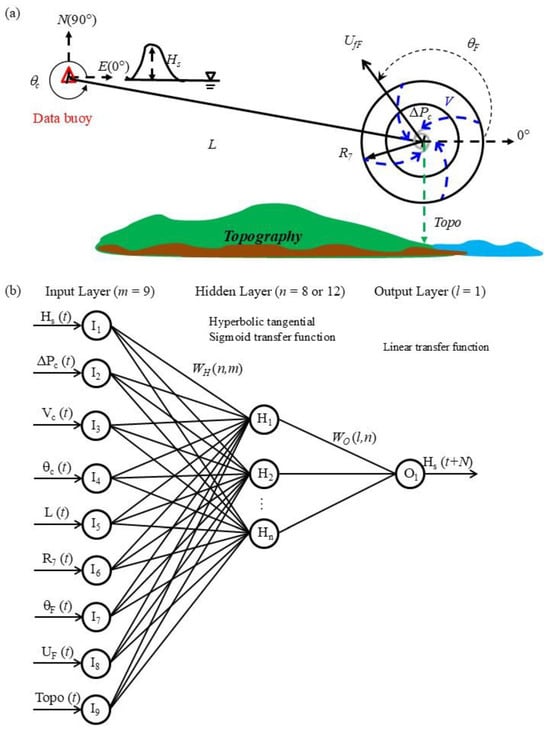 (a) Sketch of effective controlling parameters for typhoon wave prediction; (b) architecture of the back-propagation neural network.