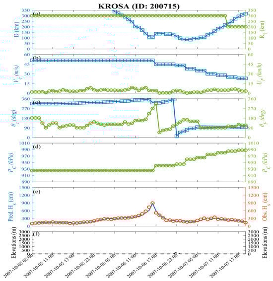 The time series variation of effective parameters for Typhoon Krosa is presented in Figure 4. Figure 4a shows the distance between the typhoon center and the observation station (L) and the storm’s radius (R7). Figure 4b displays the maximum wind speed near the center (Vc) and the forward speed of the typhoon (UF). Figure 4c shows the relative angle and the forward movement angle of the typhoon. Figure 4d,e illustrate the central pressure (Pc) and significant wave height Hs, respectively, while Figure 4f depicts the terrain elevation at the typhoon center.
