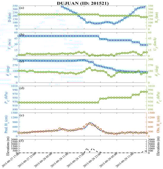 Figure 5 presents the validation event of Typhoon Dujuan, which presents similar results. The central pressure of Typhoon Dujuan was also 925 hPa (indicating a strong typhoon), with a maximum wind speed of 51 m/s. The storm’s radius was smaller than that of Typhoon Krosa, at about 220 km. The elevation changes along the typhoon’s path were more significant than those experienced by Typhoon Krosa. However, since the elevation did not exceed 1000 m, the impact on the wind field structure was limited, allowing the maximum wind speed to remain at 51 m/s. The closest distance of the typhoon center was approximately 106 km from the station, resulting in a significant wave height of 807 cm, smaller than that generated by Typhoon Krosa.