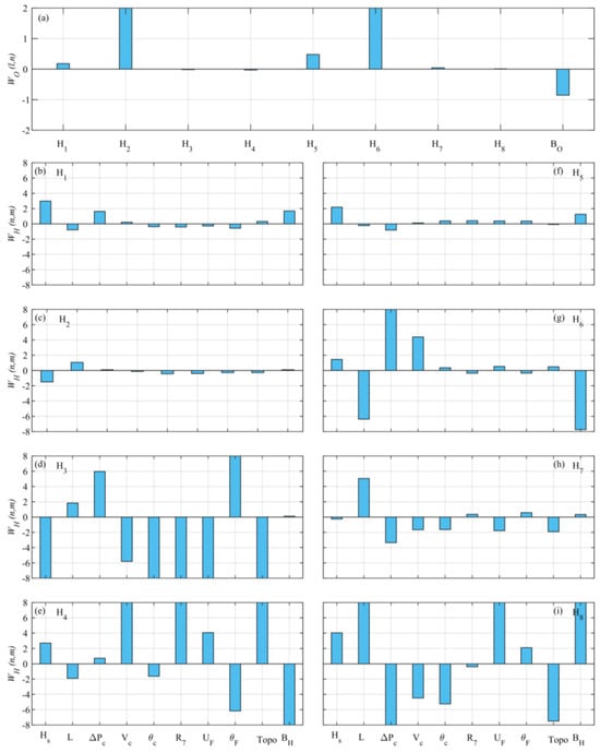 Figure 6b–i provide input weights and bias values for each hidden neuron and different input factors. Hidden neuron H1 has a bias value of 1.69, with corresponding weights: significant wave height (Hs) 2.99, relative distance (L) −0.79, typhoon central pressure difference () 1.63, maximum wind speed (Vc) 0.22, relative angle (), storm radius (R7) −0.41, typhoon forward speed (UF) −0.28, forward angle () −0.56, and local topography elevation (Topo) 0.32. These weights account for 177%, 47%, 97%, 13%, 22%, 24%, 16%, 33%, and 19% of the bias value, respectively.