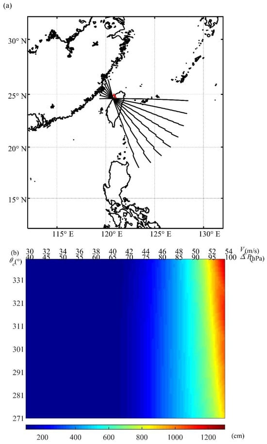 Experiments were conducted using synthetic typhoons based on empirical formulas to explore the maximum significant wave height variation under different conditions. Based on historical typhoon events collected in this study, the input parameters, such as the pressure difference, were considered in the 40 to 100 hPa range. The maximum wind speed was calculated using the empirical formula . It was assumed that the typhoon moves in a straight line at a speed of 18 km/h without considering significant variations that could be caused by atmospheric conditions along its path, ranging from 270° to 340° (refer to the path illustration in Figure 7a). After 36 h, the typhoon will land between Taitung and Hualien, at 90 to 120 km to the west or southwest of the buoy station.