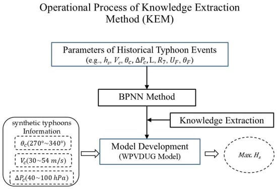 Figure 7b depicts the distribution relationships between the maximum significant wave height, pressure difference, maximum wind speed, and relative angle. The offshore wind is stronger when the initial angle is between 271° and 300°, and the maximum significant wave height ranges from 800 to 1000 cm. When the angle is between 300° and 340°, the onshore wind influences the waves, and the maximum significant wave height increases to between 1000 and 1350 cm. For example, when a strong typhoon exhibits a central pressure difference of 100 hPa, the empirical formula estimates the near-center wind speed to reach 54 m/s. When the typhoon center is located southwest of the observation station, the relative angle is approximately 335°. The corresponding maximum significant wave height reaches 13.5 m, likely due to the onshore wind direction associated with this angle. These results are consistent with observational data (such as records during the Typhoon Jangmi and Typhoon Dujuan periods). The operational process of the knowledge extraction method (KEM) is shown in Figure 8.