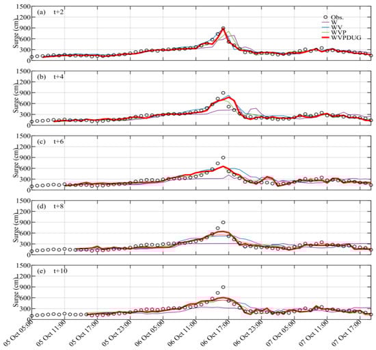 Figure 12, Figure 13 and Figure 14 show the validation results for long-lead predictions. Compared to Typhoon Krosa, whose significant wave height rapidly increased to a peak, Typhoon Dujuan showed a more gradual change in significant wave height. Therefore, the W model could reasonably describe its result at t + 2 h, with statistical indicators of RMSE = 88.39 cm, MAE = 60.15 cm, and CC = 0.840 (refer to Table 4). As the prediction time increased to 10 h, its performance significantly deteriorated, with RMSE = 190 cm, MAE = 128.56 cm, and CC = 0.189. When the carefully considered WVPDUG model was used, it provided a better description of the changes in typhoon waves. At the 10 h forecast, the performance improved to RMSE = 86.17 cm, MAE = 69.63 cm, and CC = 0.878, with improvement rates of 0.55, 0.45, and 3.66, respectively.