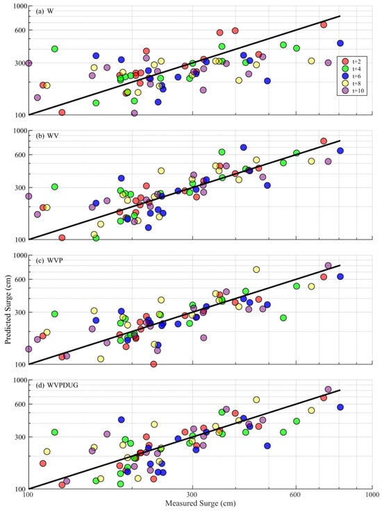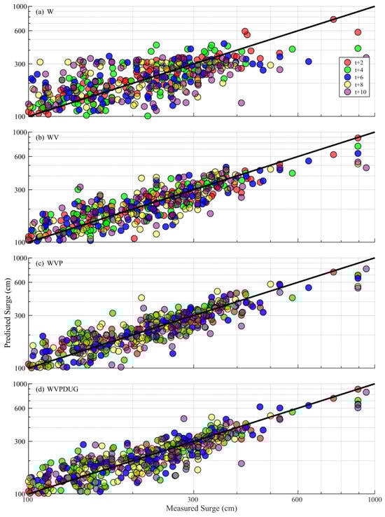 Scatter plots of predicted and measured typhoon waves for all validation events under different input combinations (from top to bottom panels) and lead time (various color symbols): (a) W, (b) WV, (c) WVP, and (d) WVPDUG.