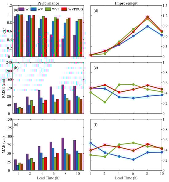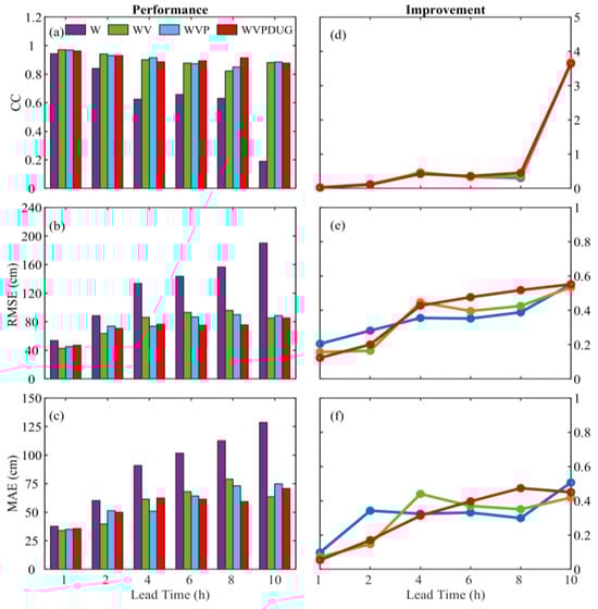 Validation event performance and predictive improvements measured using (a,d) RMSE, (b,e) correlation coefficient, and (c,f) MAE.